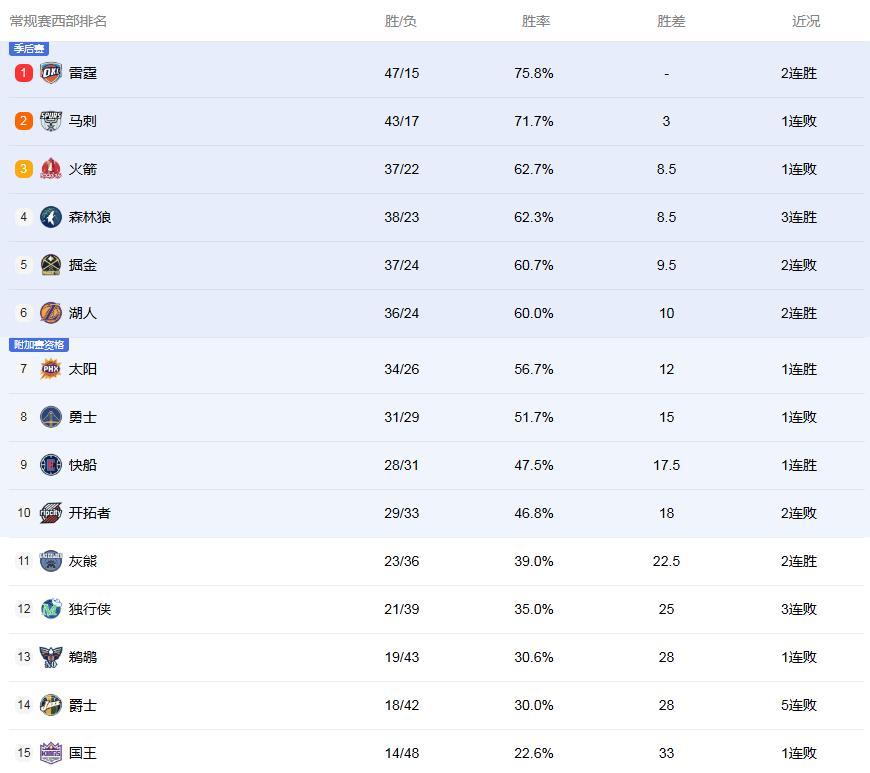 湖人队在吃到3连败后,战胜勇士、国王,取得了2连胜,战绩变成了36胜24负,排名掉到了西部第6位!